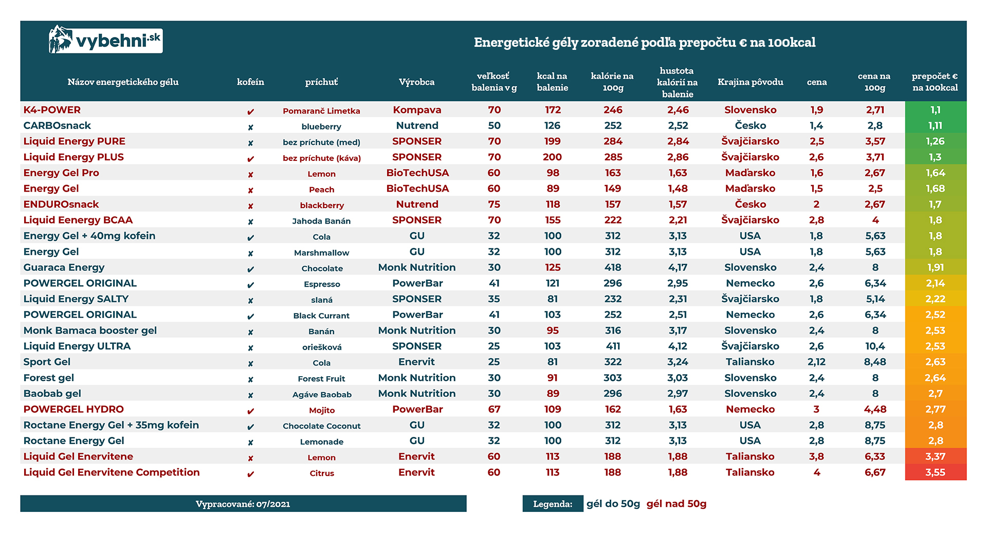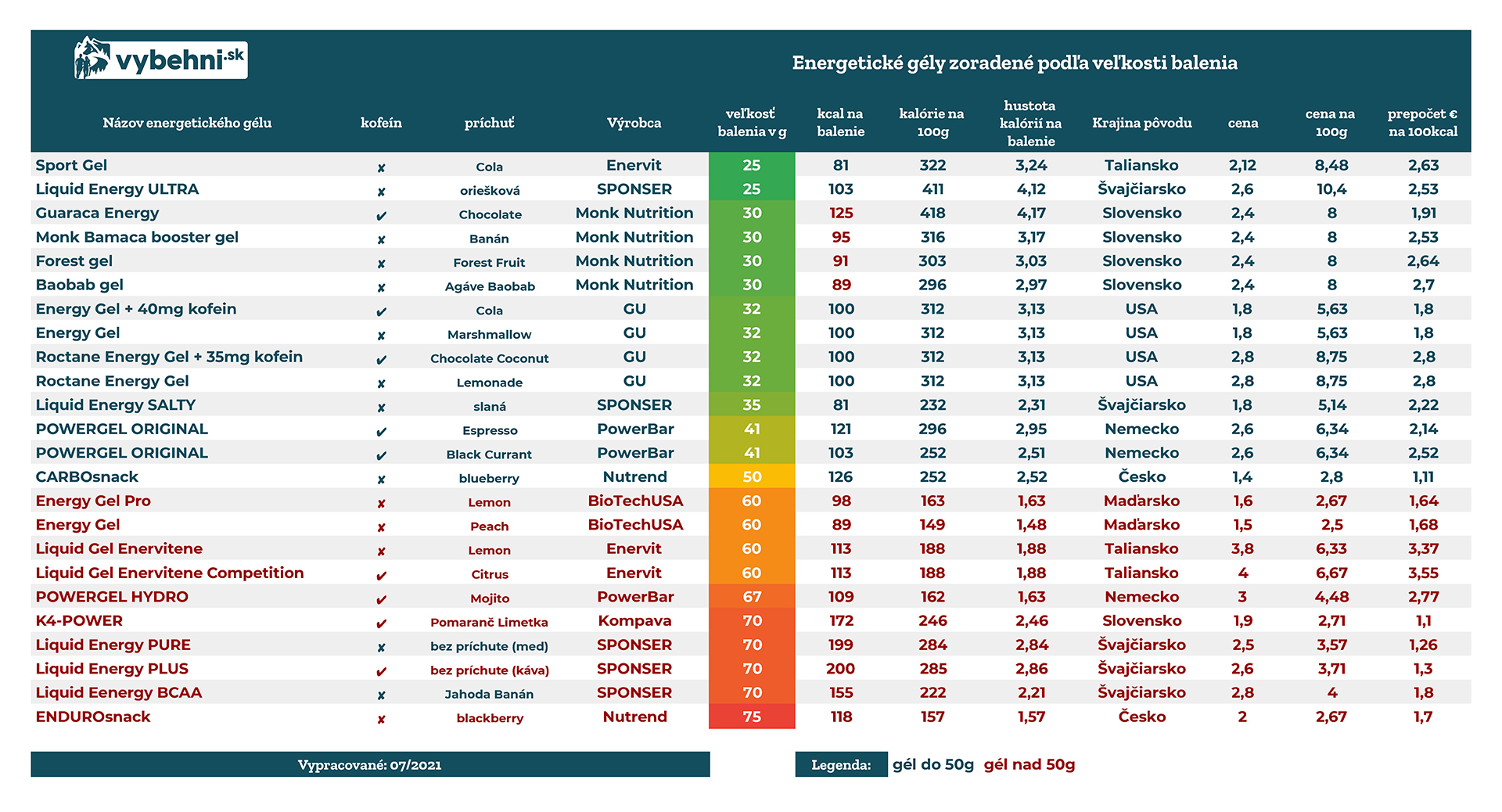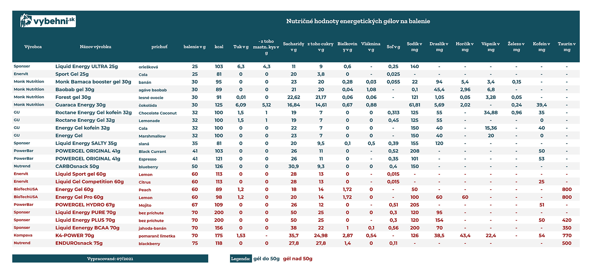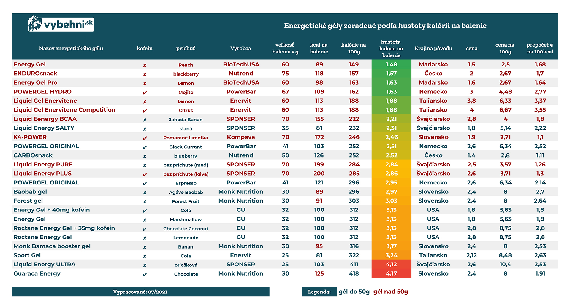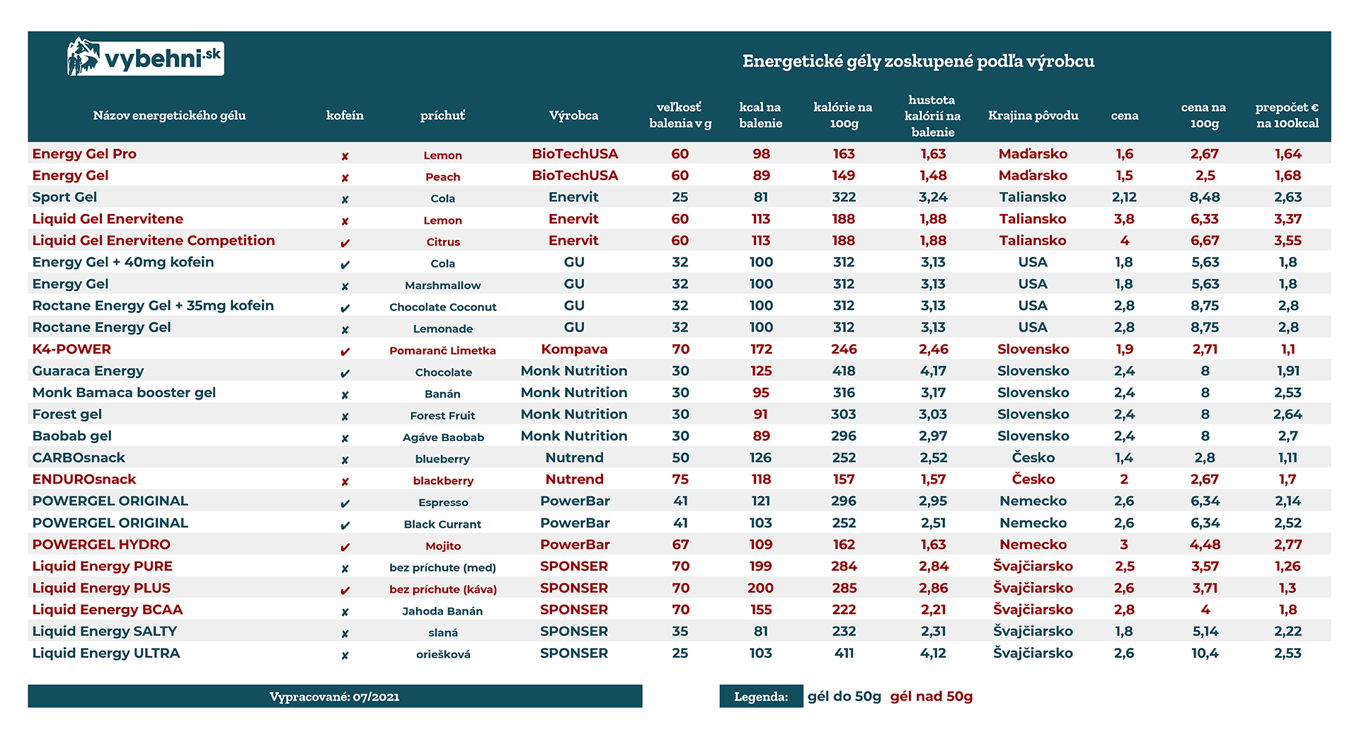 | Názov energetického gélu | kofeín | príchuť | Výrobca |